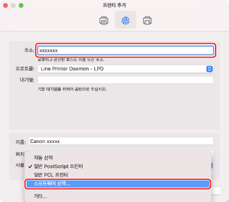 - 프린터 연결 : 무선 LAN을 통해 연결하는 경우, 프린터를 드라이버에 연결합니다. USB 연결의 경우, USB 케이블을 통해 연결합니다.