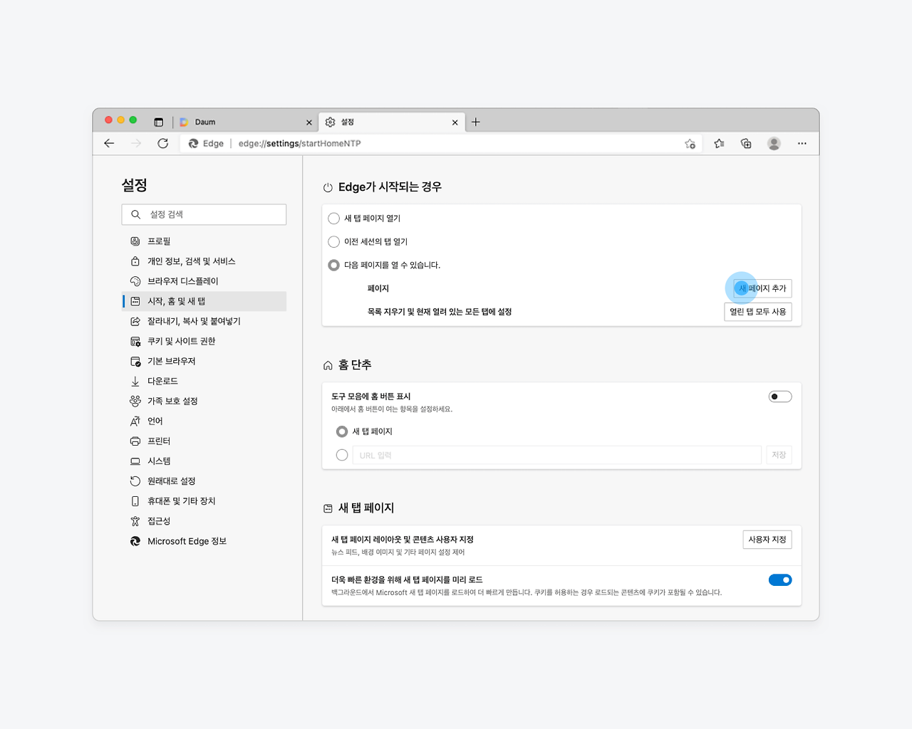 - '특정 페이지 또는 페이지 모음 열기'를 선택한 후, '새 페이지 추가'를 클릭하여 https://www.daum.net을 입력합니다.